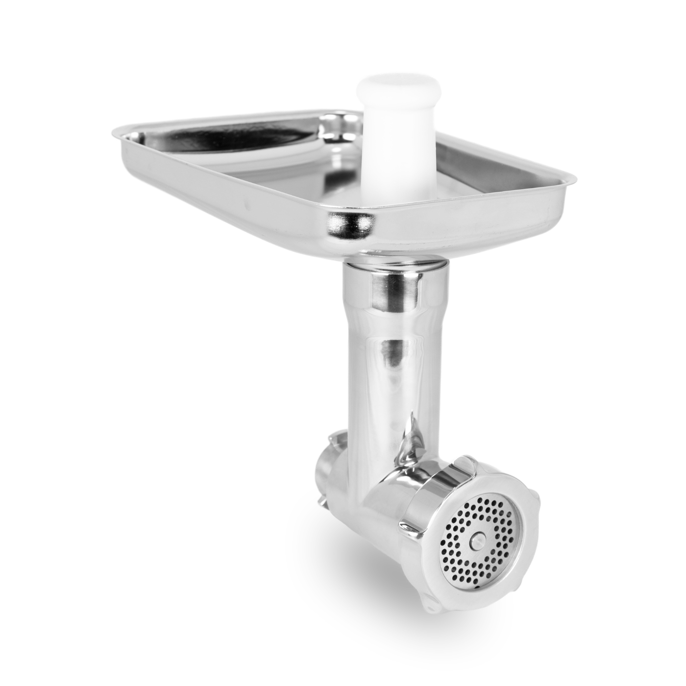 Der edle unter den Edelstahlwölfen. Mit Direktanschluss für die Küchenmaschinen von KENWOOD mit Twist-Anschluss, WILFA Probaker und SMEG. Komplett aus Edelstahl, Größe 5. Dieser Fleischwolf Vorsatz macht einen wirklich glänzenden Eindruck, sowohl optisch wie auch in der Leistung. Beinahe alles, was auf den Tisch kommt, können Sie mit diesem Edelstahlwolf rasch und einfach verarbeiten: Gemüse, Früchte, Fisch und Fleisch. Egal, ob roh oder gekocht. Für den perfekten Transport sorgt die Schnecke aus poliertem Edelstahl, das hochwertige, 4-flüglige Edelstahl-Messer und die Lochscheiben aus Edelstahl sorgen für die richtige Konsistenz. Im Lieferumfang sind ein Flügelmesser, vier Lochscheiben, der großzügige Einfülltrichter, der Stopfer, sowie ein Spritzgebäckvorsatz und ein Wurstfüllhorn enthalten. Da alle Einzelteile aus Edelstahl sind, ist der Fleischwolf Spülmaschinengeeignet.